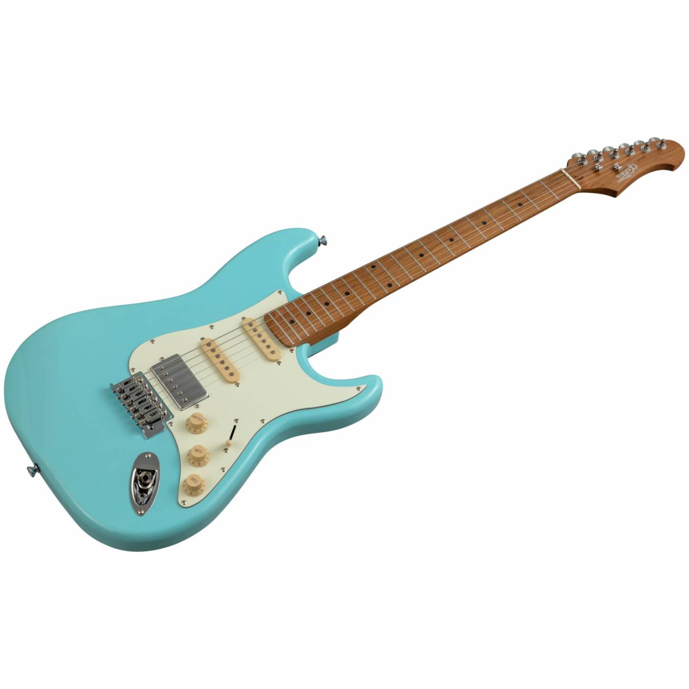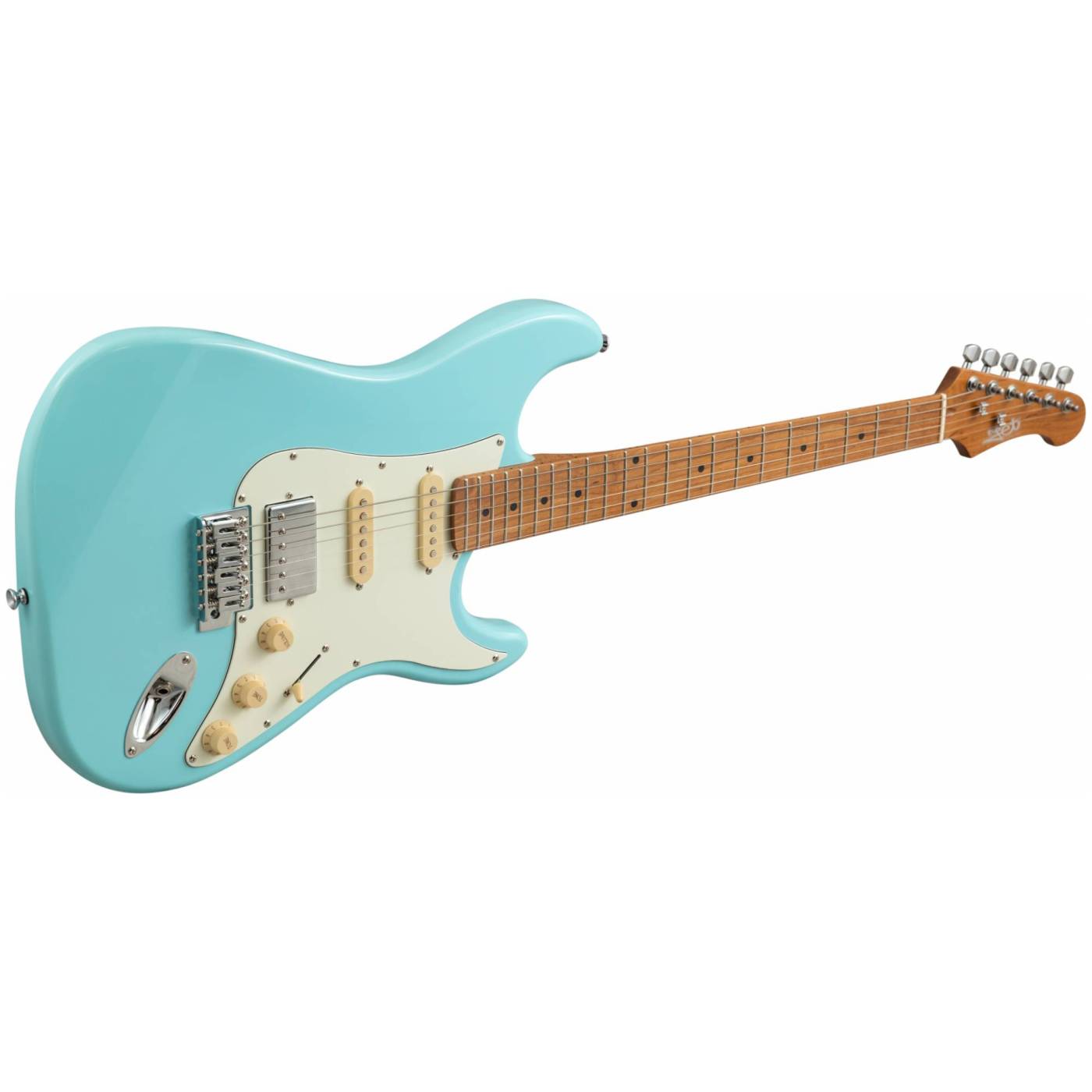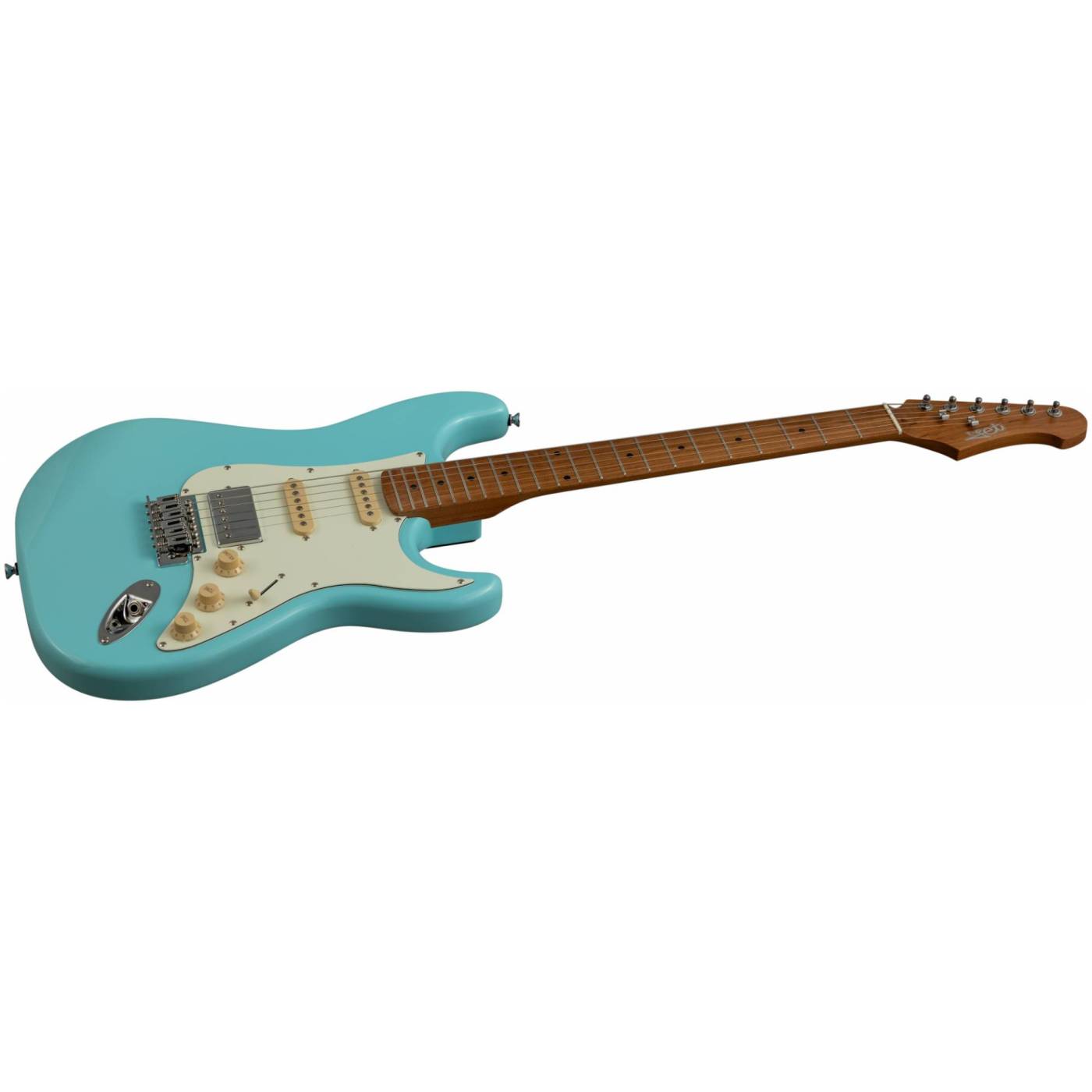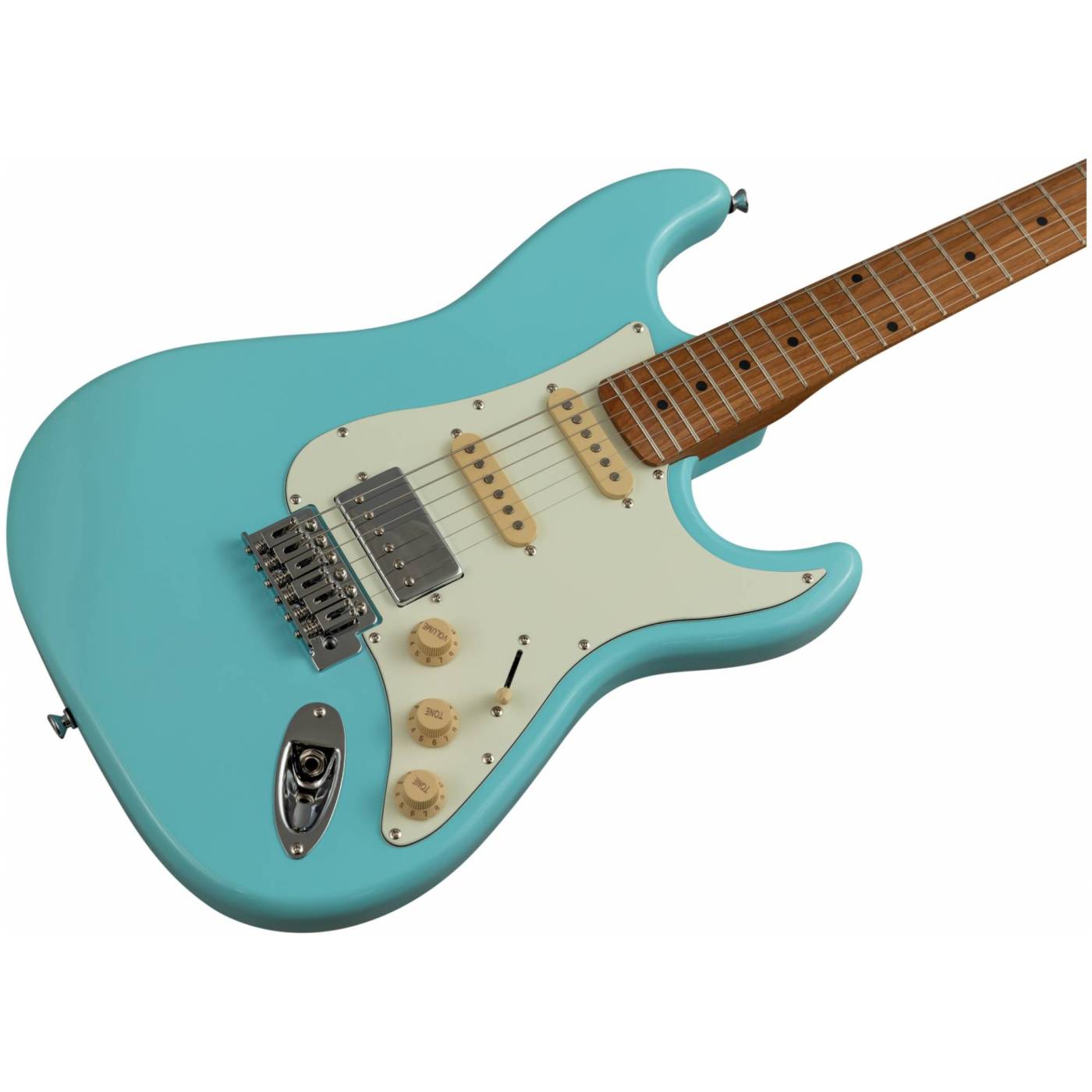Гриф и накладка на гриф выполнены из печеного клена (roasted maple). При такой обработке поры дерева максимально сжимаются и в процессе использования вода уже не будет выходить, ваша накладка не сожмется и лады не повылазят вне зависимости от влажности и смены температуры. Плюс такое дерево выглядит очень красиво.
